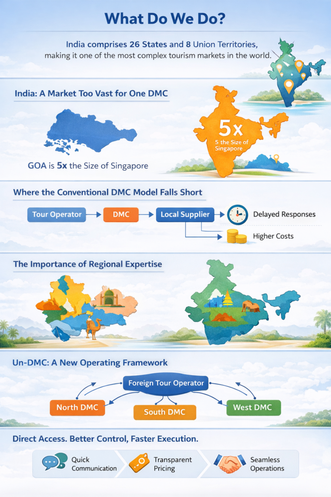 Un-DMC, a brand of UnDMC India Pvt Ltd., addresses these challenges by directly connecting foreign tour operators with regional DMCs and specialized operators across India.